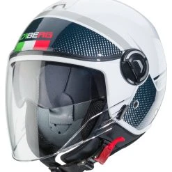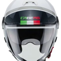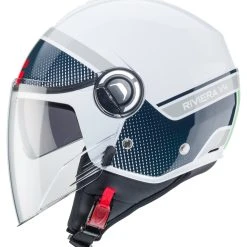 The jet helmet *Riviera V4* from Caberg is the successor of the *Riviera V3*. It impresses with modern designs and with innovative, elegant looks. Compared to the previous model, Caberg has given the helmet a longer visor and a longer sun visor, so you can experience better light and visibility protection and more comfort.